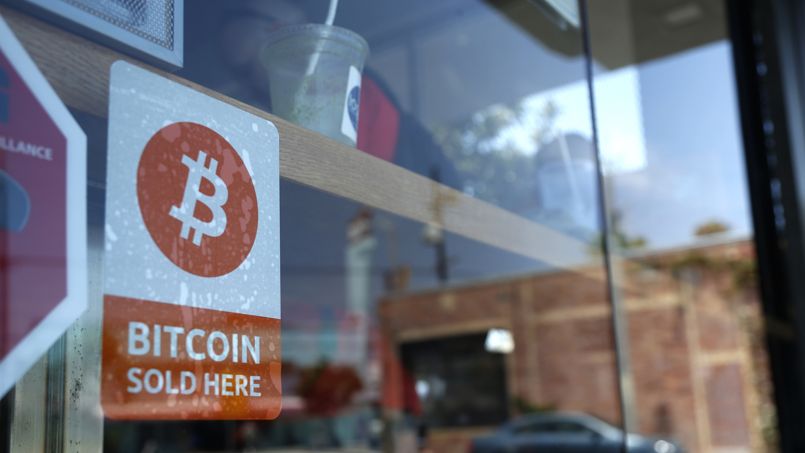 A bitcoin sticker is seen in the window of Locali Conscious Convenience store, where one of Southern California’s first two bitcoin-to-cash ATMs began operating today, in Venice